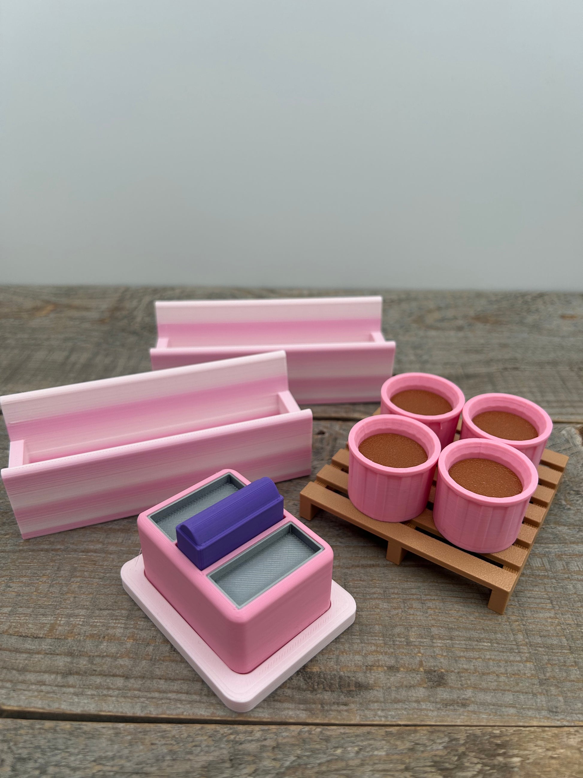 1 waterbowl, 1 set of 4 mineral tubs on pallet, and 2 feed bunks